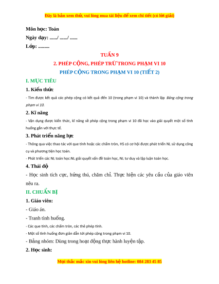 Ngày dạy: ....../ ....../ ...... L p: ớ ......... TUẦN 9 2. PHÉP C N Ộ G, PHÉP TR Ừ TRONG PH M Ạ VI 10 PHÉP C N Ộ G TRONG PH M Ạ VI 10 (TI T Ế 1) I. M C Ụ TIÊU 1. Ki n t ế h c ứ