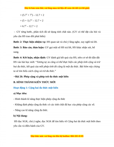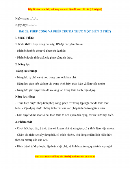 BÀI 26: PHÉP CỘNG VÀ PHÉP TRỪ ĐA THỨC MỘT BIẾN (2 TIẾT) I. MỤC TIÊU: