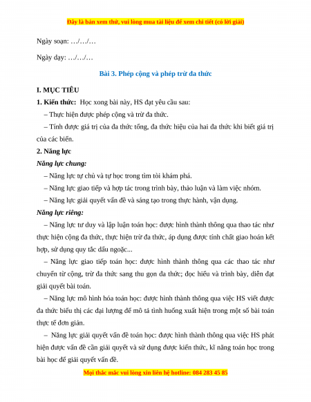 Bài 3. Phép cộng và phép trừ đa thức I. MỤC TIÊU