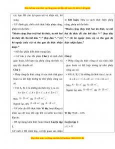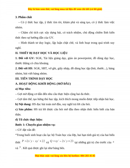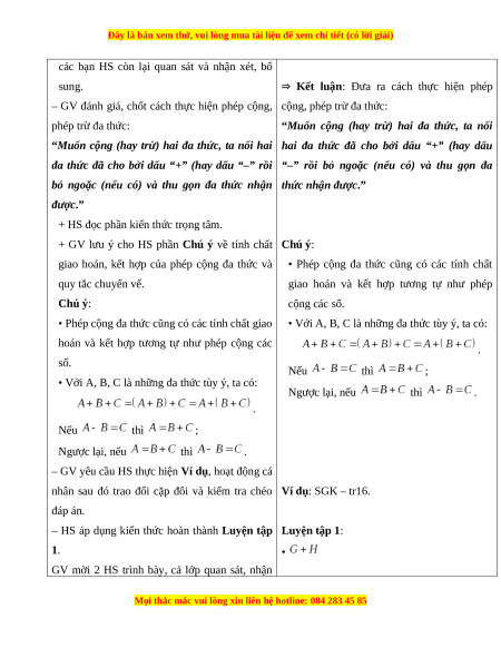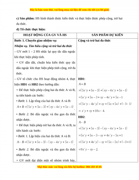 – Thực hiện được cộng trừ đa thức thông qua tính chất của phép cộng đa thức và quy tắc dấu ngoặc. b) Nội dung: