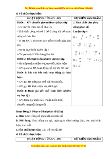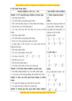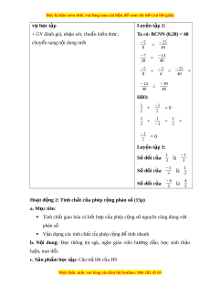 S: −a = −a = + 5 = −2 = b b −b 12 12 12 - Số đ i ố c a ủ 0 là 0. −1 2 - HS t l ự àm luy n t ệ p ậ 3 −8 - GV phát vấn m t ộ vài HS cho k t ế qu . ả + −19 = −27 11 11 12 Bư c ớ 2: HS th c hi ự n nh ệ i m ệ v h ụ c t ọ p ậ HĐ2: + HS ti p ế nh n nhi ậ m ệ v , t ụ rao đ i ổ , th o ả lu n. ậ Ta có: BCNN (7,40) = 28 + GV quan sát HS ho t ạ đ ng, ộ h t ỗ r khi ợ HS c n ầ 5 = 20 7 28 Bư c ớ 3: Báo cáo k t ế quả ho t ạ đ ng ộ và th o ả −3 luận = −21 4 28 + GV g i ọ HS đ ng ứ t i ạ ch t ỗ r l ả i ờ câu h i ỏ . 5 + −3 = 20 + + GV g i ọ HS khác nh n xét ậ , đánh giá. 7 4 28 Bư c ớ 4: Đánh giá k t ế quả th c ự hi n ệ nhi m ệ −21 = −1 28 28 M i ọ thắc m c