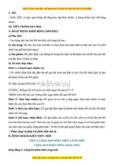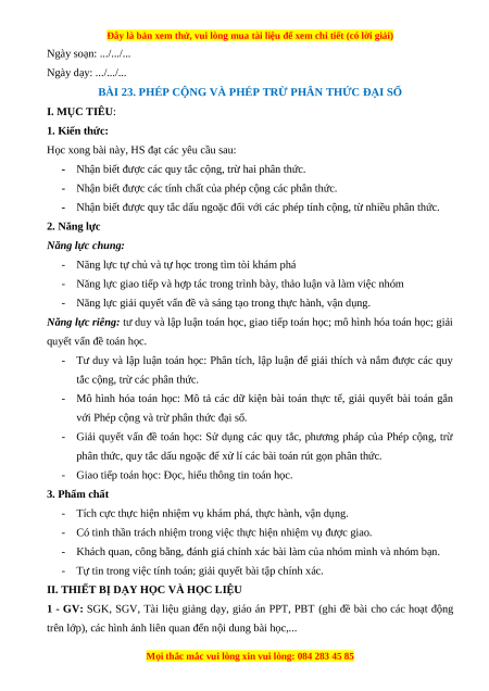 BÀI 23. PHÉP CỘNG VÀ PHÉP TRỪ PHÂN THỨC ĐẠI SỐ I. MỤC TIÊU: