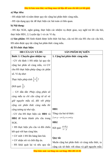 - HS nhận biết và nắm được quy tắc cộng hai phân thức cùng mẫu.