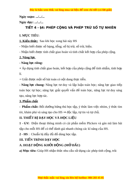 TIẾT 4 - §4: PHÉP CỘNG VÀ PHÉP TRỪ SỐ TỰ NHIÊN I. M C Ụ TIÊU: 1. Ki n t ế h c