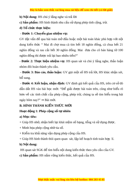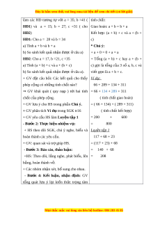 ứ : Sau khi h c ọ xong bài này HS - Nh n ậ bi t ế đư c s ợ ố h ng, t ạ ổng; s b ố t ị r , s ừ t ố r , hi ừ u. ệ - Nh n ậ bi t ế đư c ợ tính ch t ấ giao hoán và tính ch t ấ k t ế h p ợ c a phép c ủ ng. ộ 2. Năng l c ự - Năng l c ri ự êng: + Áp d ng ụ tính ch t ấ giao hoán, k t ế h p ợ c a ủ phép c ng ộ đ ể tính nh m ẩ , tính h p ợ lí. + Gi i ả đư c ợ m t ộ s bài ố toán có n i ộ dung th c ự ti n. ễ - Năng l c ự chung: Năng l c ự tư duy và l p ậ lu n ậ toán h c; ọ năng l c ự giao ti p ế toán h c ọ tự h c; ọ năng l c ự gi i ả quy t ế v n ấ đề toán h c, ọ năng l c ự tư duy sáng t o, năng l ạ c ự h p t ợ ác. 3. Ph m ẩ chất - Phẩm ch t ấ : Bồi dư ng h ỡ ng t ứ hú h c ọ t p, ý t ậ h c l ứ àm vi c nhóm ệ , ý th c t ứ ìm