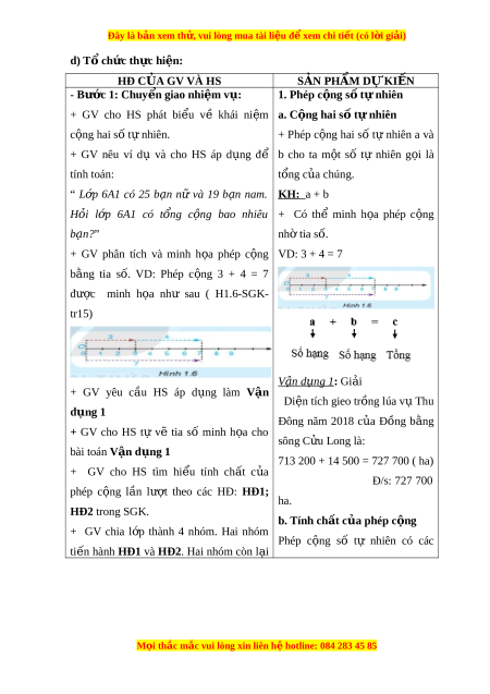 d) Tổ chức thực hi n: ệ HĐ C A Ủ GV VÀ HS SẢN PHẨM DỰ KI N Ế - Bước 1: Chuy n gi ể ao nhi m ệ v : ụ 1. Phép c ng ộ s t ố n ự hiên + GV cho HS phát bi u ể về khái ni m ệ a. C ng hai ộ số t nhi ự ên c ng hai ộ số tự nhiên. + Phép c ng ộ hai số tự nhiên a và