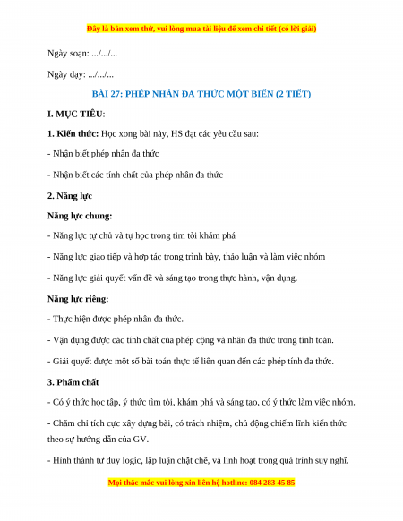 BÀI 27: PHÉP NHÂN ĐA THỨC MỘT BIẾN (2 TIẾT) I. MỤC TIÊU: