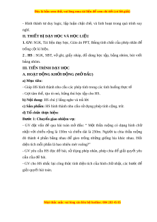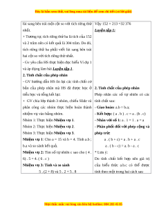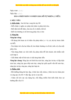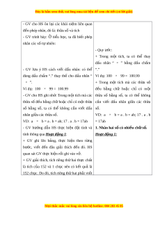 ủ phép nhân để tính nhanh, tính nh m ẩ m t ộ cách h p ợ lí. - Gi i ả đư c m ợ t ộ số bài toán có n i ộ dung th c t ự i n. ễ Năng l c ự chung: Năng l c ự mô hình hóa toán h c, ọ năng l c ự t ư duy và l p ậ lu n ậ toán h c; ọ năng l c ự giao ti p ế toán h c; ọ năng l c ự gi i ả quy t ế v n ấ đề toán h c, ọ năng l c t ự duy s ư áng t o, năng ạ l c h ự p t ợ ác. 3. Ph m ẩ chất - Bồi dư ng ỡ h ng t ứ hú h c t ọ p, ậ ý th c l ứ àm vi c nhóm ệ , ý th c t ứ ìm tòi, khám phá và sáng t o cho H ạ S ⇒ đ c l ộ p, ậ t t ự in và t ch ự . ủ - Chăm chỉ tích c c ự xây d ng ự bài, chủ đ ng ộ chi m ế lĩnh ki n ế th c ứ theo sự hư ng d ớ ẫn c a G ủ V. M i ọ thắc m c