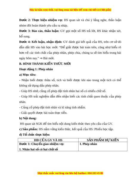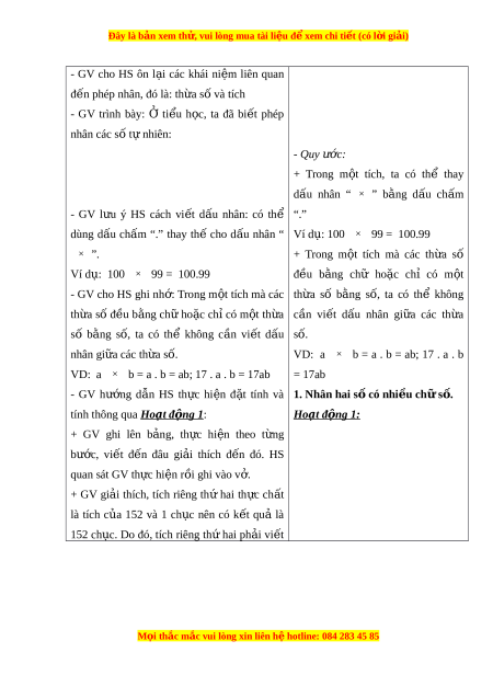 Đây là bản xem th , vu ử i lòng mua tài li u ệ đ xe ể m chi ti t ế (có l i ờ gi i ả ) - GV cho HS ôn l i ạ các khái ni m ệ liên quan đ n phép nhân, đó l ế à: th a ừ s và t ố ích - GV trình bày: Ở ti u ể h c, ọ ta đã bi t ế phép nhân các số t nhi ự ên: - Quy ư c: ớ + Trong m t ộ tích, ta có thể thay