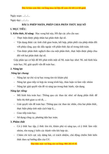 BÀI 3: PHÉP NHÂN, PHÉP CHIA PHÂN THỨC ĐẠI SỐ I. MỤC TIÊU: