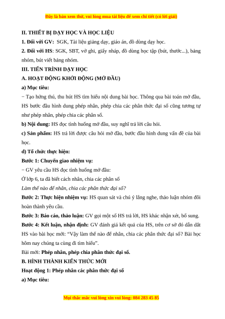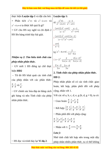 hỏi. HS thực hiện được phép nhân hai phân thức đại số. Vận dụng được các tính