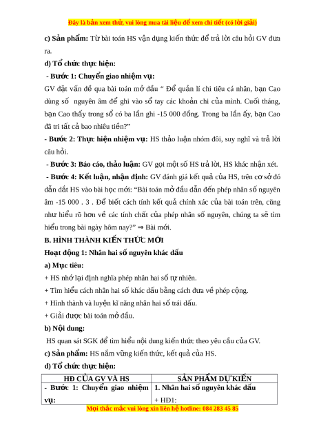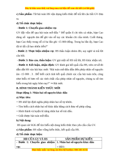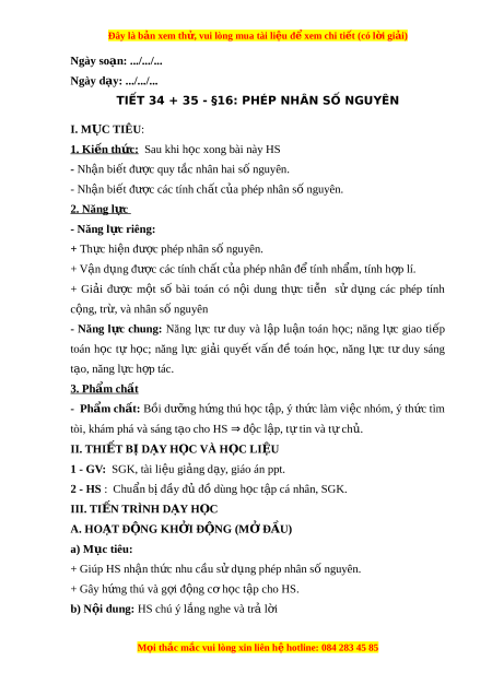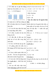 ứ : Sau khi h c ọ xong bài này HS - Nh n ậ bi t ế đư c quy t ợ ắc nhân hai số nguyên. - Nh n ậ bi t ế đư c ợ các tính ch t ấ c a phép nhân ủ s nguyên. ố 2. Năng l c ự - Năng l c ri ự êng: + Th c ự hi n đ ệ ư c ợ phép nhân số nguyên. + V n ậ d ng đ ụ ư c ợ các tính ch t ấ c a phép nhân ủ đ t ể ính nh m ẩ , tính h p l ợ í. + Gi i ả đư c ợ m t ộ số bài toán có n i ộ dung th c ự ti n ễ sử d ng ụ các phép tính c ng, t ộ r , và nhân s ừ ố nguyên - Năng l c ự chung: Năng l c ự tư duy và l p ậ lu n ậ toán h c; ọ năng l c ự giao ti p ế toán h c ọ tự h c; ọ năng l c ự gi i ả quy t ế v n ấ đề toán h c, ọ năng l c ự tư duy sáng t o, năng l ạ c ự h p t ợ ác. 3. Ph m ẩ chất - Phẩm ch t ấ : Bồi dư ng h ỡ ng t ứ hú h c ọ t p, ý t ậ h c l ứ àm vi c nhóm ệ , ý th c t ứ ìm