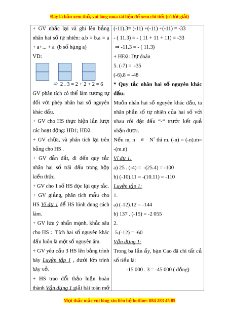 ế m, n ∈ N* thì m. (-n) = (-n).m= b ng cho H ả S . -(m.n) + GV d n ẫ d t ắ , đi đ n ế quy t c ắ Ví d 1: ụ nhân hai số trái d u ấ trong h p ộ a) 25 . (-4) = -(25.4) = -100 ki n t ế h c. ứ b) (-10).11 = -(10.11) = -110 + GV cho 1 s H ố S đ c l ọ i ạ quy t c. ắ Luy n t ệ p 1: ậ + GV gi ng, ả phân tích m u ẫ cho 1.