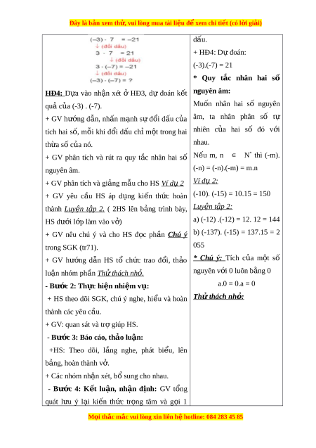 ớ phép nhân hai số nguyên Muốn nhân hai số nguyên khác d u, ấ ta khác dấu. nhân ph n ầ số tự nhiên c a ủ hai số v i ớ + GV cho HS th c ự hi n ệ l n ầ lư t ợ nhau rồi đ t ặ d u ấ “-“ trư c ớ k t ế quả các ho t ạ đ ng: ộ HĐ1; HĐ2. nh n đ ậ ư c. ợ + GV ch a, ữ và phân tích l i ạ trên N u
