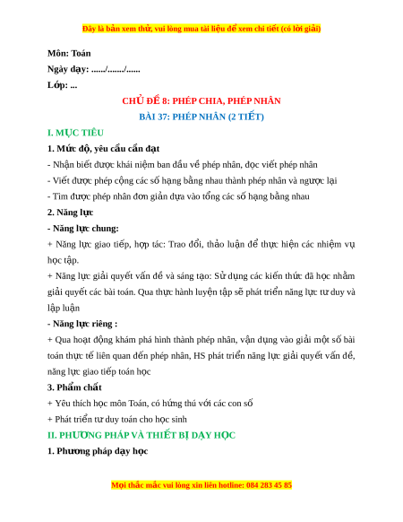 ế phép nhân, HS phát tri n ể năng l c ự gi i ả quy t ế v n ấ đ , ề năng l c ự giao ti p t ế oán h c ọ 3. Phẩm ch t ấ + Yêu thích h c m ọ ôn Toán, có h ng ứ thú v i ớ các con số + Phát tri n t ể duy t ư oán cho h c s ọ inh II. PHƯ N Ơ G PHÁP VÀ THI T Ế B D Ị Y Ạ H C Ọ 1. Phư ng ơ pháp d y h ạ c ọ M i