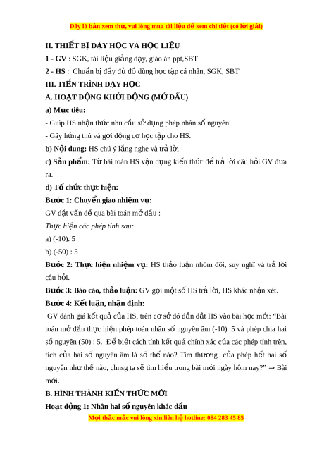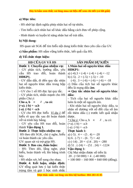 Đây là bản xem th , vu ử i lòng mua tài li u ệ đ xe ể m chi ti t ế (có l i ờ gi i ả ) a) M c t ụ iêu: - HS nh l ớ i ạ đ nh ngh ị ĩa phép nhân hai s t ố nhi ự ên. - Tìm hi u cách ể nhân hai số khác d u b ấ ng ằ cách đ a ư v phép c ề ng. ộ - Hình thành và luy n kĩ ệ năng nhân hai s t ố rái d u. ấ b) N i ộ dung: