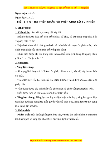 TIẾT 5 + 6 - §5: PHÉP NHÂN VÀ PHÉP CHIA SỐ TỰ NHIÊN I. M C Ụ TIÊU: 1. Ki n t ế h c