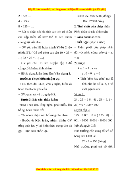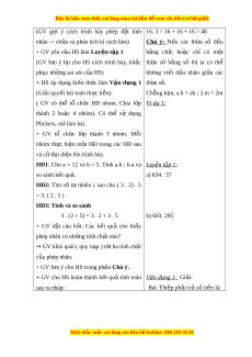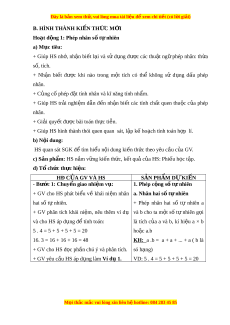 ủ phép nhân ( a × b; a.b; ab) tùy hoàn c nh ả c t ụ h ) ể . + Tìm đư c t ợ ích c a ủ hai th a s ừ ; ố tìm đư c t ợ hư ng ơ và s d ố ( ư n u có) ế c a m ủ t ộ phép chia. + V n ậ d ng đ ụ ư c ợ các tính ch t ấ c a phép nhân ủ và phép c ng t ộ rong tính toán. + Gi i ả đư c ợ m t ộ s bài ố toán có n i ộ dung th c ự ti n. ễ - Năng l c ự chung: Năng l c ự tư duy và l p ậ lu n ậ toán h c; ọ năng l c ự giao ti p ế toán h c ọ tự h c; ọ năng l c ự gi i ả quy t ế v n ấ đề toán h c, ọ năng l c ự tư duy sáng t o, năng l ạ c ự h p t ợ ác. 3. Ph m ẩ chất - Phẩm ch t ấ : Bồi dư ng h ỡ ng t ứ hú h c ọ t p, ý t ậ h c l ứ àm vi c nhóm ệ , ý th c t ứ ìm