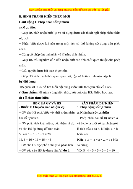 B. HÌNH THÀNH KI N Ế TH C Ứ M I Ớ Hoạt đ ng 1: ộ Phép nhân s t ố n ự hiên a) M c t ụ iêu: + Giúp HS nh , ớ nh n ậ bi t ế l i ạ và s ử d ng ụ đư c ợ các thu t ậ ng ữ phép nhân: th a ừ số, tích. + Nh n ậ bi t ế đư c ợ khi nào trong m t