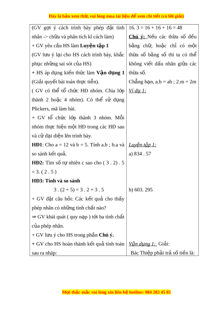 HĐ3: Tính và so sánh 3 . (2 + 5) = 3 . 2 + 3 . 5 b) 603. 295 + GV đ t ặ câu h i ỏ : Các k t ế quả cho th y ấ phép nhân có nh ng t ữ ính chất nào? ⇒ GV khái quát ( quy n p ạ ) t i ớ ba tính ch t ấ c a phép nhân. ủ + GV l u ý cho ư HS trong ph n ầ Chú ý.