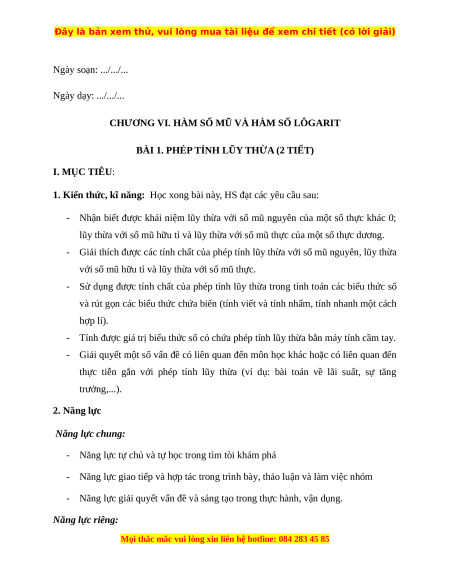 BÀI 1. PHÉP TÍNH LŨY THỪA (2 TIẾT) I. MỤC TIÊU: