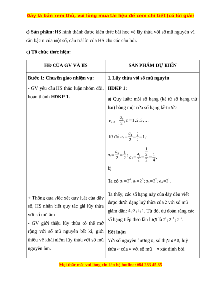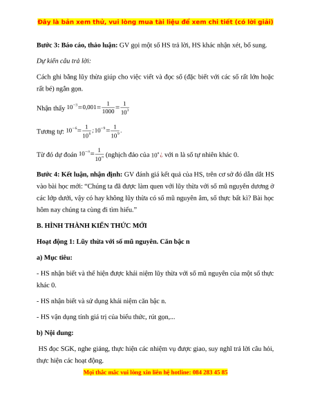 Hoạt động 1: Lũy thừa với số mũ nguyên. Căn bậc n a) Mục tiêu:
