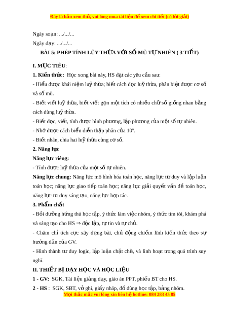 BÀI 5: PHÉP TÍNH LŨY TH A Ừ V I Ớ S MŨ Ố T N Ự HIÊN ( 3 TI T Ế ) I. M C Ụ TIÊU: 1. Ki n t ế h c ứ : H c ọ xong bài này, HS đ t ạ các yêu c u s ầ au: - Hi u ể đư c ợ khái ni m ệ lu ỹ th a; ừ bi t ế cách đ c ọ lu t ỹ h a, ừ phân bi t ệ đư c ợ c s ơ ố và số mũ. - Bi t ế vi t ế luỹ th a, ừ bi t ế vi t ế g n ọ m t ộ tích có nhi u ề ch ữ s ố gi ng ố nhau b ng ằ cách dùng lu t ỹ h a. ừ - Bi t ế đ c, vi ọ t ế , tính đư c ợ bình phư ng, l ơ p ph ậ ư ng ơ c a m ủ t ộ số t nhi ự ên. - Nhớ đư c cách ợ bi u di ể n t ễ h p phân ậ c a 10 ủ n. - Bi t ế nhân, chia hai lu t ỹ h a ừ cùng c s ơ . ố 2. Năng l c ự Năng l c ự riêng: - Tính đư c ợ lu t ỹ h a c ừ a ủ m t ộ s t ố nhi ự ên. Năng l c ự chung: Năng l c ự mô hình hóa toán h c, ọ năng l c ự t ư duy và l p ậ lu n ậ toán h c; ọ năng l c ự giao ti p ế toán h c; ọ năng l c ự gi i ả quy t ế v n ấ đề toán h c, ọ năng l c t ự duy s ư áng t o, năng ạ l c h ự p t ợ ác. 3. Ph m ẩ chất - Bồi dư ng ỡ h ng t ứ hú h c t ọ p, ậ ý th c l ứ àm vi c nhóm ệ , ý th c t ứ ìm tòi, khám phá và sáng t o cho H ạ S ⇒ đ c l ộ p, ậ t t ự in và t ch ự . ủ - Chăm chỉ tích c c ự xây d ng ự bài, chủ đ ng ộ chi m ế lĩnh ki n ế th c ứ theo sự hư ng d ớ ẫn c a G ủ V.