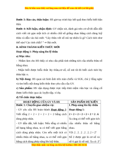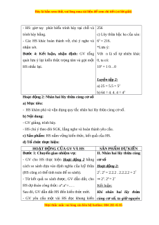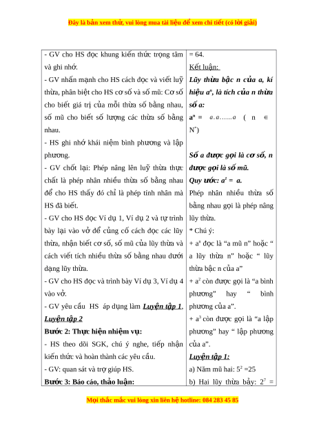 ấ đó chỉ là phép tính nhân mà Phép nhân nhi u ề th a ừ số HS đã bi t ế . b ng ằ nhau g i ọ là phép nâng - GV cho HS đ c ọ Ví dụ 1, Ví d ụ 2 và t ự trình lũy th a. ừ bày l i ạ vào vở để c ng ủ cố cách đ c ọ các lũy * Chú ý: th a, ừ nh n ậ bi t ế cơ s , ố số mũ c a ủ lũy th a ừ và + an đ c ọ là “a mũ n” ho c ặ “ cách vi t ế tích nhi u ề th a ừ số b ng ằ nhau dư i ớ a lũy th a ừ n” ho c ặ “ lũy d ng l ạ ũy th a. ừ th a ừ b c n c ậ a ủ a” - GV cho HS đ c ọ và trình bày Ví d 3, ụ Ví dụ 4 + a2 còn đư c ợ g i ọ là “a bình vào v . ở phư ng” ơ hay “ bình - GV yêu c u ầ HS áp d ng ụ làm Luy n ệ t p ậ 1, phư ng ơ c a a”. ủ Luy n t ệ ập 2 + a3 còn đư c ợ g i ọ là “a l p ậ Bư c ớ 2: Th c hi ự n nhi ệ m ệ v : ụ phư ng” ơ hay “ l p ậ phư ng ơ