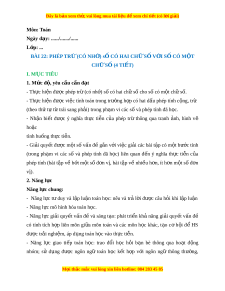 Ngày dạy: ....../......./...... L p: ớ ... BÀI 22: PHÉP TR ( Ừ CÓ NH ) Ớ s C Ố Ó HAI CH S Ữ Ố V I Ớ S C Ố Ó M T Ộ CH S Ữ ( Ố 4 TIẾT) I. M C Ụ TIÊU 1. Mức đ , ộ yêu c u c ầ n đ ầ t ạ - Th c hi ự n đ ệ ư c ợ phép tr ( ừ có nh ) ớ s có hai ố chữ s cho s ố có m ố t ộ chữ s . ố - Th c hi ự n đ ệ ư c ợ vi c t ệ ính toán trong trư ng ờ h p có hai ợ d u phép t ấ ính c ng, t ộ rừ (theo th t ứ t ự t ừ rái sang ph i ả ) trong ph m ạ vi các s và phép t ố ính đã h c. ọ - Nh n ậ bi t ế đư c ợ ý nghĩa th c ự ti n ễ c a