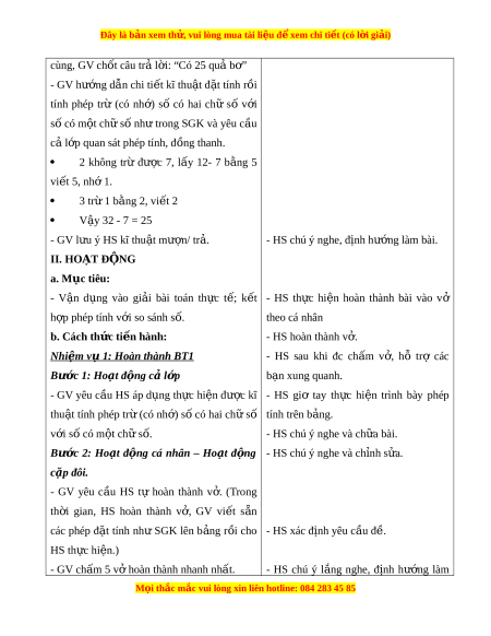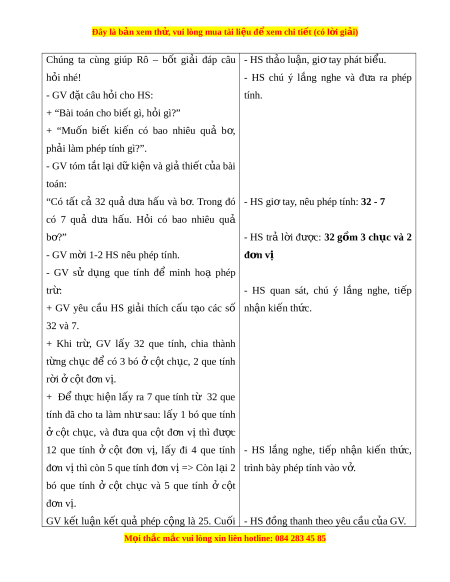 ơ ay, nêu phép tính: 32 - 7 có 7 quả d a ư h u. ấ H i ỏ có bao nhiêu quả b ?” ơ - HS trả l i ờ đư c: ợ 32 g m ồ 3 ch c ụ và 2 - GV m i ờ 1-2 HS nêu phép tính. đ n v ơ ị - GV sử d ng