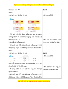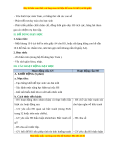 ể hả các chấm tròn, nên làm g n m ọ i ồ khung n a t ử gi ờ y ấ A4). 2. H c ọ sinh: - 20 chấm tròn (trong b đ ộ dùng h ồ c ọ Toán ). - V , ở sách giáo khoa, nháp. III. CÁC HO T Ạ Đ N Ộ G D Y Ạ H C Ọ Hoạt đ ng c ộ a G ủ V Hoạt đ ng c ộ a H ủ S A. KH I Ở Đ N Ộ G (5 phút) a. Mục tiêu: - T o h ạ ng kh ứ i ở đ h ể c ọ sinh vào bài m i ớ - Xác định m c năng l ứ c ự hi n t ệ i ạ c a H ủ S - K t ế nối hi u bi ể t ế đã có v i ớ ki n t ế h c ứ m i ớ b. Cách th c ứ ti n hàn ế h: - HS ho t ạ đ ng ộ theo nhóm (bàn) và th c ự hi n ệ l n ầ - HS chỉ vào b c ứ tranh nói lư t ợ các ho t ạ đ ng ộ sau: cho b n ạ nghe v b ề c ứ tranh - GV yêu c u ầ HS quan sát b c ứ tranh (trong SGK trang 32 ho c ặ trên máy chi u) ế . - GV yêu cầu HS th o ả lu n nhóm ậ /bàn: B c t ứ ranh vẽ - HS chia sẻ gì? - HS chia s t ẻ rư c l ớ p. ớ - GV h i