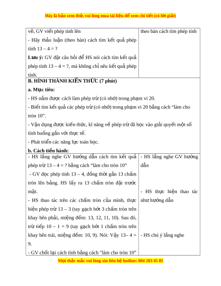 phép tính 13 – 4 = ?, mà không ch nêu ỉ k t ế qu phép ả tính. B. HÌNH THÀNH KI N Ế TH C Ứ (7 phút) a. Mục tiêu: - HS n m ắ đư c ợ cách làm phép tr ( ừ có nh ) ớ trong ph m ạ vi 20. - Bi t ế tìm k t ế qu các phép t ả r ( ừ có nh ) ớ trong ph m ạ vi 20 b ng ằ cách “làm cho tròn 10”. - V n ậ d ng đ ụ ư c ợ ki n t ế h c, kĩ ứ năng v phép t ề r đã h ừ c ọ vào gi i ả quy t ế m t ộ số tình huống g n v ắ i ớ th c ự t . ế - Phát tri n các ể năng l c t ự oán h c. ọ b. Cách ti n h ế ành: - HS l ng ắ nghe GV hư ng ớ d n ẫ cách tìm k t ế quả - HS l ng ắ nghe GV hư ng ớ phép tr 13 – 4 = ? b ừ ng