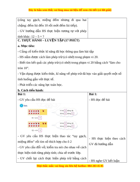 Đây là bản xem th , vu ử i lòng mua tài li u ệ đ xe ể m chi ti t (c ế ó l i ờ gi i ả ) (cũng tay g ch, ạ mi ng ệ đ m ế nh ng ư đi qua hai ch ng: ặ đ m ế lùi đ n 10 r ế i ồ m i ớ đ m ế lùi ti p) ế . - GV hư ng ớ d n ẫ HS th c ự hi n ệ tư ng ơ tự v i ớ phép tính khác: 12 – 5 = ? C. TH C Ự HÀNH – LUY N Ệ T P Ậ (17 PHÚT) a. Mục tiêu: - C ng c ủ ố ki n t ế h c ứ kĩ năng đã h c t ọ hông qua làm bài t p ậ - HS n m ắ đư c ợ cách làm phép tr ( ừ có nh ) ớ trong ph m ạ vi 20. - Bi t ế tìm k t ế qu các phép t ả r ( ừ có nh ) ớ trong ph m ạ vi 20 b ng ằ cách “làm cho tròn 10”. - V n ậ d ng đ ụ ư c ợ ki n t ế h c, kĩ ứ năng v phép t ề r đã h ừ c ọ vào gi i ả quy t ế m t ộ số tình huống g n v ắ i ớ th c ự t . ế - Phát tri n các ể năng l c t ự oán h c. ọ b. Cách ti n h ế ành: Bài 1: Bài 1: - GV yêu cầu HS đ c đ ọ bài ề - HS đ c đ ọ bài ề - GV yêu c u ầ HS th c ự hi n ệ thao tác “tay g ch, ạ - HS th c ự hi n ệ theo cách mi ng đ ệ m ế ” r i ồ tìm s t ố hích h p ợ cho ô 2 GV đã hư ng ớ d n ẫ - GV yêu c u ầ đ i ổ v , ở ki m ể tra nói cho nhau v ề cách th c ự hi n t ệ ính t ng phép t ừ ính; chia sẻ trư c ớ l p. ớ - GV ch t ố l i ạ cách th c ự hi n ệ phép trừ b ng