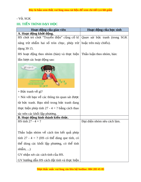 Đây là bản xem th , vu ử i lòng mua tài li u ệ đ xe ể m chi ti t (c ế ó l i ờ gi i ả ) phép tr d ừ ng ạ 27 - 4 = ? + Đ t ặ tính (th ng ẳ c t ộ ). + Th c ự hi n t ệ ính t t ừ rái sang ph i ả : HS l y ấ b ng ả con cùng làm v i ớ GV t ng ừ thao tác: đ t ặ tính; trừ từ 7 tr 4 b ừ ng 3, vi ằ t ế 3. ph i ả sang trái, đ c ọ k t ế qu . ả Hạ 2, vi t ế 2. + Đ c ọ k t ế qu : ả V y 27 - ậ 4 = 23. HS đ i ổ b ng ả con, nói cho b n ạ bên GV chốt l i ạ cách th c ự hi n, ệ đề nghị m t ộ vài c nh ạ nghe cách đ t ặ tính và tính HS ch vào phép t ỉ ính nh c ắ l i ạ cách tính. c a m ủ ình. GV vi t ế m t