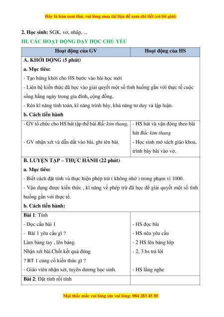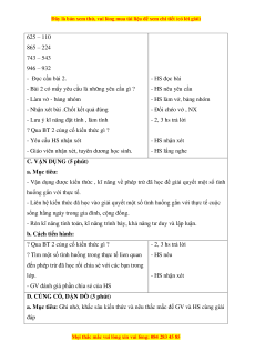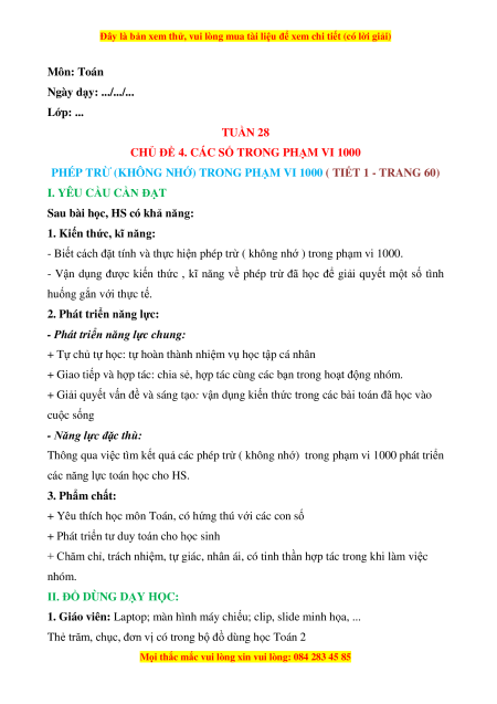 - Biết cách đặt tính và thực hiện phép trừ ( không nhớ ) trong phạm vi 1000.