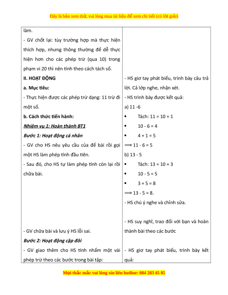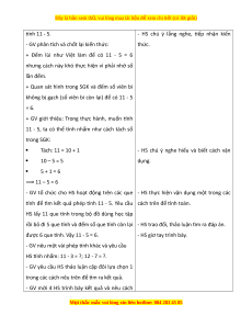 Ngày dạy: ....../......./...... L p: ớ ... BÀI 11: PHÉP TR ( Ừ QUA 10) TRONG PH M Ạ VI 20 (5 TI T Ế ) I. M C Ụ TIÊU 1. Mức đ , ộ yêu c u c ầ n đ ầ t ạ - Bi t ế ý nghĩa c a ủ phép trừ và bi t ế cách tìm k t