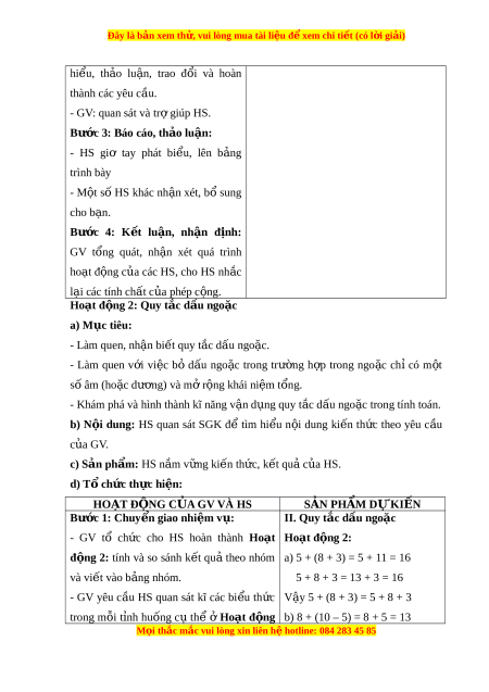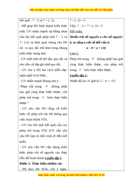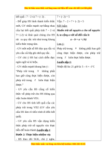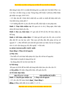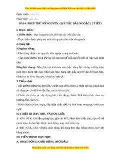 Đây là bản xem th , vu ử i lòng mua tài li u ệ đ xe ể m chi ti t ế (có l i ờ gi i ả ) Ngày so n: ạ …/…/… Ngày d y: ạ …/…/… BÀI 4: PHÉP TRỪ S N Ố GUYÊN, QUY T C Ắ D U Ấ NGO C Ặ ( 2 TIẾT) I. M C Ụ TIÊU: 1. Ki n t ế h c ứ : H c ọ xong bài này, HS đ t ạ các yêu c u s ầ au: - Th c ự hiện được phép tr m ừ t ộ số nguyên cho m t ộ số nguyên 2. Năng l c ự Năng l c ự riêng: - V n d ậ ng ụ đư c các ợ quy t c d ắ u ngo ấ c ặ trong tính toán. - V n ậ d ng ụ đư cc ợ phép tr các ừ s ố nguyên đ gi ể i ả quy t ế m t ộ s ố bài toán th c ự ti n. ễ Năng l c ự chung: Năng l c ự mô hình hóa toán h c, ọ năng l c ự t ư duy và l p ậ lu n ậ toán h c; ọ năng l c ự giao ti p ế toán h c; ọ năng l c ự gi i ả quy t ế v n ấ đề toán h c, ọ năng l c t ự duy s ư áng t o, năng ạ l c h ự p t ợ ác. 3. Ph m ẩ chất - Bồi dư ng ỡ h ng t ứ hú h c t ọ p, ậ ý th c l ứ àm vi c nhóm ệ , ý th c t ứ ìm tòi, khám phá và sáng t o cho H ạ S ⇒ đ c l ộ p, ậ t t ự in và t ch ự . ủ - Chăm chỉ tích c c ự xây d ng ự bài, chủ đ ng ộ chi m ế lĩnh ki n ế th c ứ theo sự hư ng d ớ ẫn c a G ủ V.