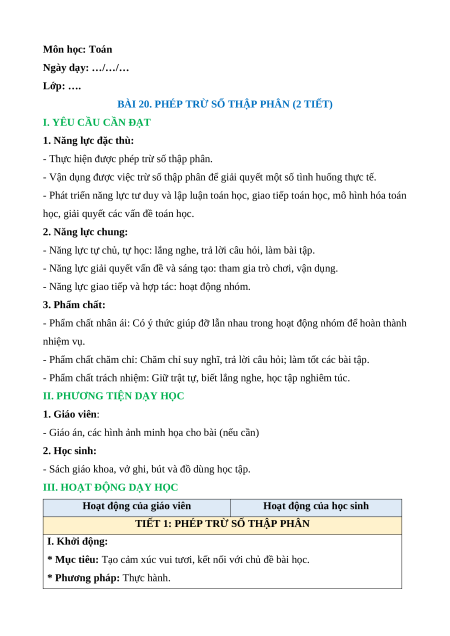 BÀI 20. PHÉP TRỪ SỐ THẬP PHÂN (2 TIẾT)