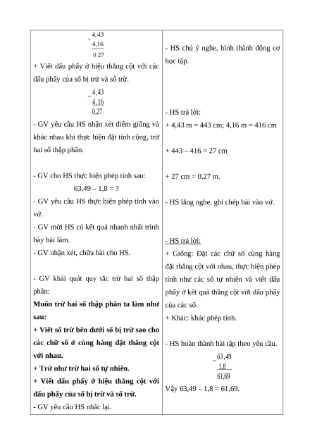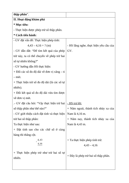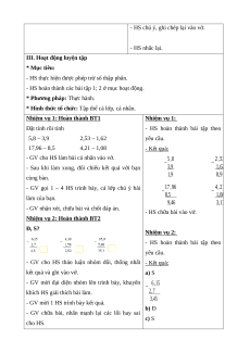 - Thực hiện được phép trừ số thập phân. * Cách tiến hành: