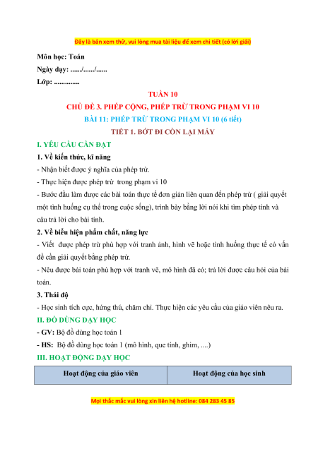 BÀI 11: PHÉP TRỪ TRONG PHẠM VI 10 (6 tiết)