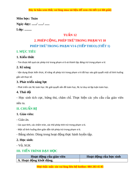 Ngày dạy: ....../ ....../ ...... L p: ớ ......... TUẦN 12 2. PHÉP C N Ộ G, PHÉP TR Ừ TRONG PH M Ạ VI 10 PHÉP TR Ừ TRONG PH M Ạ VI 6 (TI P Ế THEO) (TI T Ế 1) I. M C Ụ TIÊU 1. Ki n t ế h c ứ