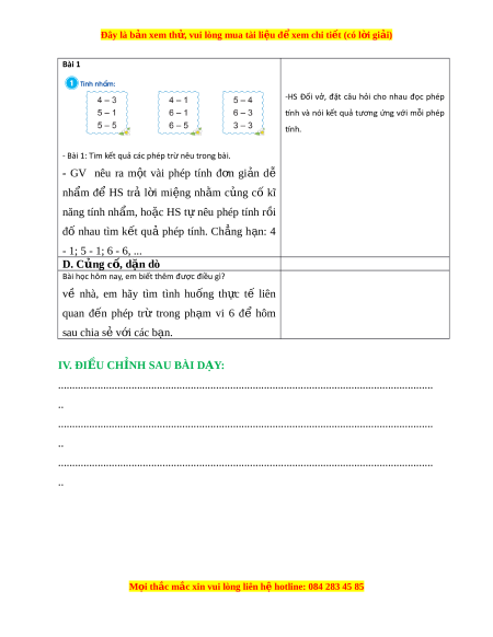 về nhà, em hãy tìm tình hu ng ố th c ự tế liên quan đ n ế phép trừ trong ph m ạ vi 6 để hôm sau chia sẻ v i ớ các b n. ạ IV. ĐIỀU CH N Ỉ H SAU BÀI D Y Ạ :