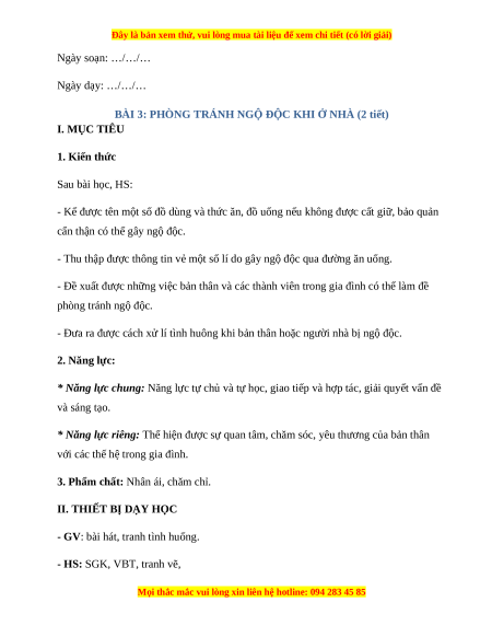 BÀI 3: PHÒNG TRÁNH NGỘ ĐỘC KHI Ở NHÀ (2 tiết) I. MỤC TIÊU 1. Kiến thức Sau bài học, HS: