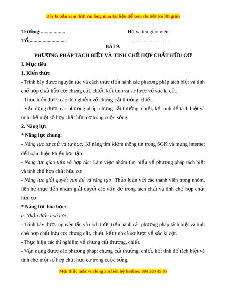 ổ ............................ …………………… BÀI 9: PHƯ N Ơ G PHÁP TÁCH BI T Ệ VÀ TINH CH H Ế P Ợ CH T Ấ H U Ữ CƠ I. M c t ụ iêu 1. Ki n t ế h c ứ - Trình bày đư c ợ nguyên t c ắ và cách th c ứ ti n ế hành các phư ng ơ pháp tách bi t ệ và tinh chế h p ch ợ ất h u c ữ : ơ ch ng ư c t ấ , chi t ế , k t ế tinh và s l ơ ư c ợ v s ề c kí ắ c t ộ . - Th c hi ự n đ ệ ư c ợ các thí nghi m ệ v ch ề ng c ư t ấ thư ng, chi ờ t ế . - V n ậ d ng ụ đư c ợ các phư ng ơ pháp: ch ng ư c t ấ thư ng, ờ chi t ế , k t ế tinh đ ể tách bi t ệ và tinh ch m ế t ộ số h p ch ợ t ấ h u c ữ t ơ rong cu c s ộ ng. ố 2. Năng l c ự * Năng l c chung ự : - Năng l c