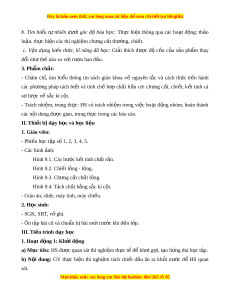 ể thông tin sách giáo khoa về nguyên t c ắ và cách th c ứ ti n ế hành các phư ng ơ pháp tách bi t ệ và tinh ch ế h p ơ ch t ấ h u ữ c : ơ ch ng ư c t ấ , chi t ế , k t ế tinh cà s l ơ ư c ợ v s ề c ắ kí c t ộ . - Trách nhi m ệ , trung th c: ự HS có trách nhi m ệ trong vi c ệ ho t ạ đ ng ộ nhóm, hoàn thành các n i ộ dung đư c ợ giao, trung th c t ự rong các báo cáo. II. Thi t ế b d ị y h ạ c ọ và h c l ọ i u ệ 1. Giáo viên: - Phi u h ế c t ọ p ậ số 1, 2, 3, 4, 5. - Các hình nh: ả Hình 9.1. Các bư c ớ k t ế tinh ch t ấ r n. ắ Hình 9.2. Chi t ế l ng - ỏ l ng. ỏ Hình 9.3. Ch ng ư c t ấ ch t ấ l ng. ỏ Hình 9.4. Tách ch t ấ b ng ằ s c kí ắ c t ộ .