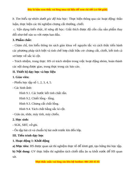 Đây là bản xem th , vu ử i lòng mua tài li u ệ đ xe ể m chi ti t (c ế ó l i ờ gi i ả ) b. Tìm hi u ể tự nhiên dư i ớ góc độ hóa h c ọ : Th c ự hi n ệ thông qua các ho t ạ đ ng: ộ th o ả lu n, ậ th c hi ự n các t ệ hí nghi m ệ ch ng c ư t ấ thư ng, chi ờ t ế . c. V n ậ d ng ụ ki n ế th c, ứ kĩ năng đã h c: ọ Gi i ả thích đư c ợ độ cồn c a ủ s n ả ph m ẩ thay đổi nh t ư h nào s ế o v i ớ rư u ban đ ợ u. ầ 3. Phẩm ch t ấ : - Chăm ch , ỉ tìm hi u