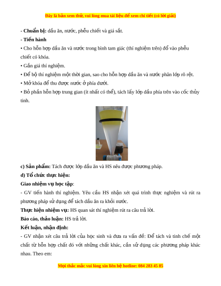 ớ rong bình tam giác (thí nghi m ệ trên) đ vào ph ổ u ễ chi t ế có khóa. • G n ắ giá thí nghi m ệ . • Để b t ộ hí nghi m ệ m t ộ th i ờ gian, sao cho h n h ỗ p d ợ u ăn và n ầ ư c ớ phân l p r ớ õ r t ệ . • M khóa đ ở t ể hu đư c ợ nư c ớ ở phía dư i ớ . • Bỏ phần hỗn h p ợ trung gian (ít nh t ấ có th ) ể , tách l y l ấ p d ớ u phí ầ a trên vào c c t ố h y ủ tinh. c) S n ph ả m ẩ : Tách đư c l ợ p d ớ ầu ăn và HS nêu đư c ợ phư ng pháp. ơ d) T ch ổ ức thực hi n: ệ Giao nhi m ệ v h ụ c ọ t p ậ : - GV ti n ế hành thí nghi m ệ . Yêu c u ầ HS nh n ậ xét quá trình th c ự nghi m ệ và rút ra phư ng ơ pháp sử d ng đ ụ t ể ách d u ăn r ầ a kh i ỏ nư c. ớ Thực hi n nhi ệ m ệ v :