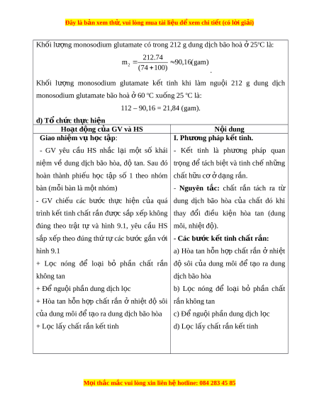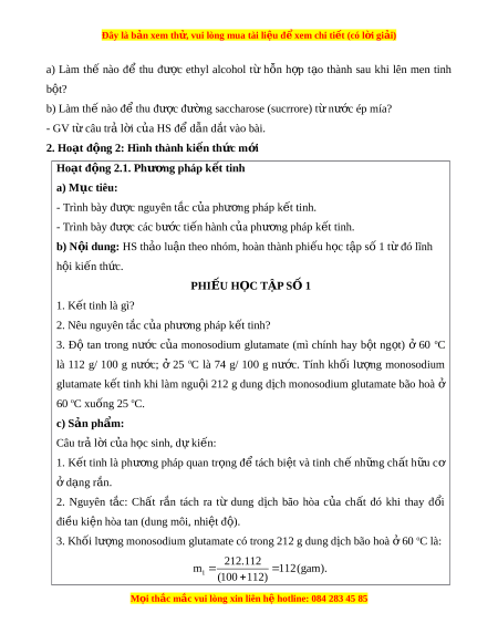 monosodium glutamate bão hoà ở 60 oC xuống 25 oC. c) S n ph ả m ẩ : Câu trả l i ờ c a h ủ c ọ sinh, d ki ự n: ế 1. K t ế tinh là phư ng ơ pháp quan tr ng ọ đ ể tách bi t ệ và tinh ch ế nh ng ữ ch t ấ h u ữ cơ ở d ng r ạ n. ắ 2. Nguyên t c: ắ Chất r n ắ tách ra từ dung d ch ị bão hòa c a ủ ch t ấ đó khi thay đ i ổ đi u ki ề