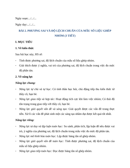 BÀI 2. PHƯƠNG SAI VÀ ĐỘ LỆCH CHUẨN CỦA MẪU SỐ LIỆU GHÉP NHÓM (3 TIẾT) I. MỤC TIÊU 1. Về kiến thức Sau bài học này, HS sẽ: