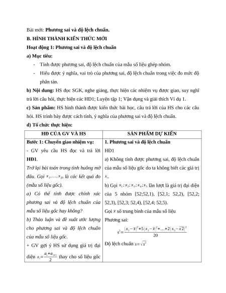 Hoạt động 1: Phương sai và độ lệch chuẩn a) Mục tiêu: